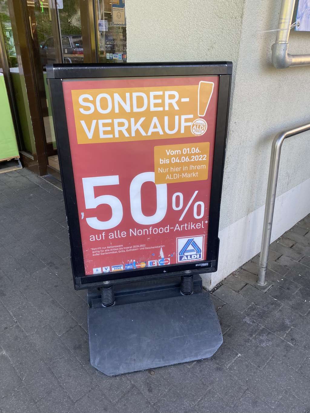 Zur Zeit vom 01.06.22- 04.06.22 gibt es in Dresden und Umgebung in einigen Aldi-Nord  Filialen eine 50% Rabatt-Aktion auf das komplette Nonfood. Auf alle Inserate bis 30.04.22 bekommt man an der Kasse 50% Nachlass.